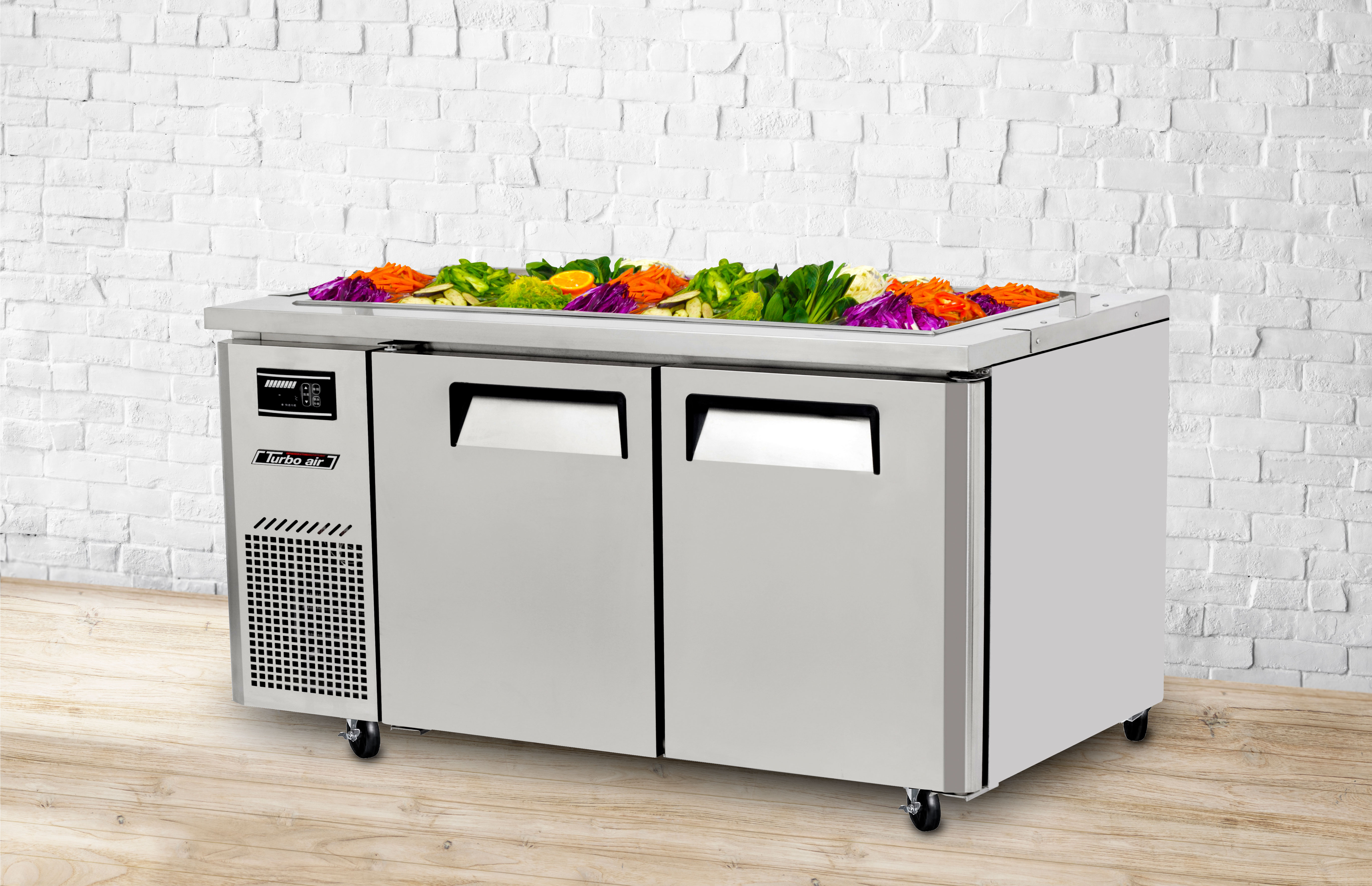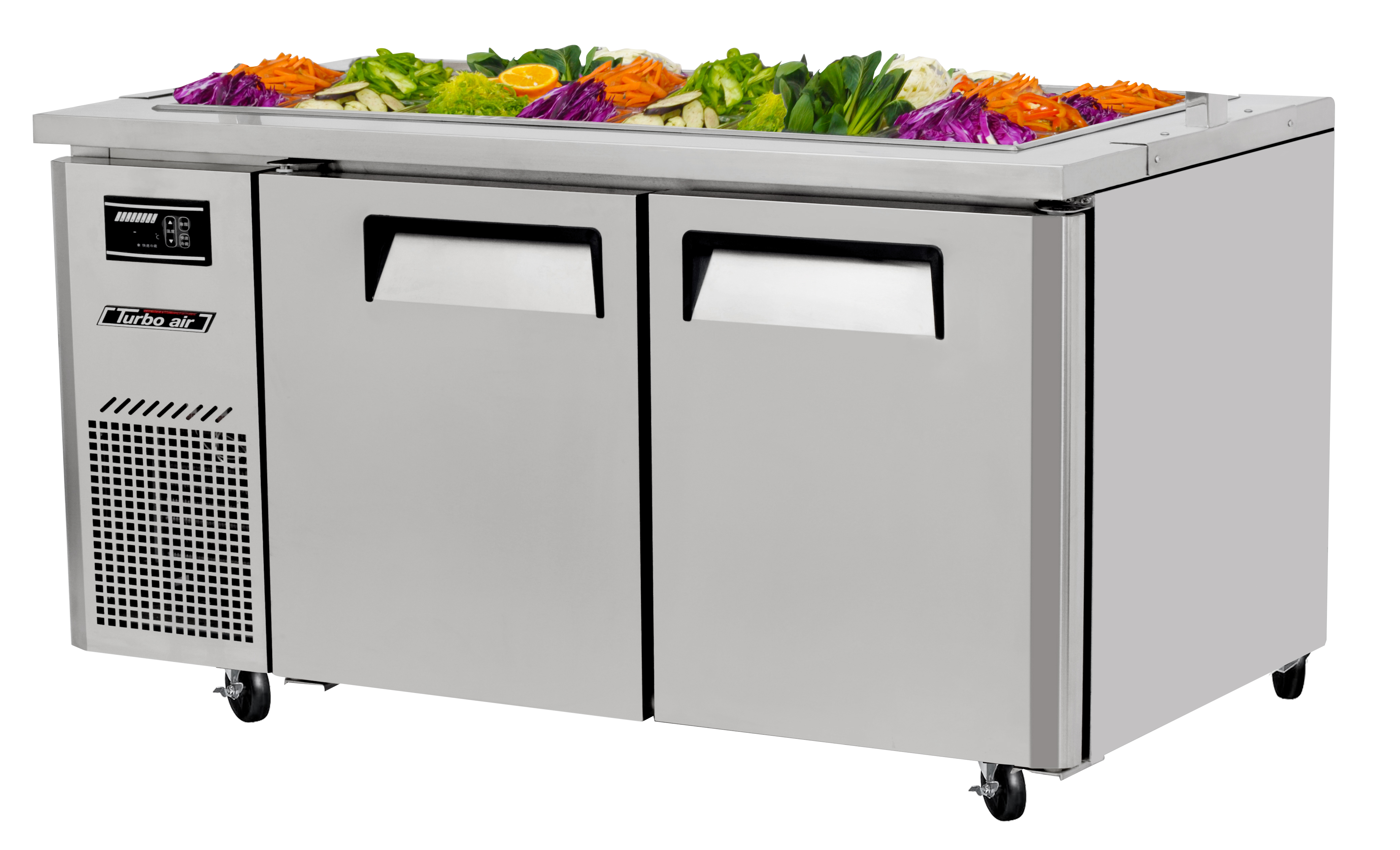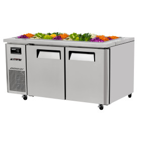 J Series Refrigerated Buffet Table-side mount, two section, 15 cu. ft., (2) stainless steel swing doors with recessed handles, stainless steel top, front, sides & back, stainless steel interior floor with aluminum side panels & door liner, hot gas condensate system, (2) PE coated wire shelf, (12) 1/3 size condiment pans included, 4" dia. swivel casters, front breathing, self-contained, 1/3 HP, 115v/60/1, 8.9 amps, NEMA 5-15P, cETLus, ETL-Sanitation
