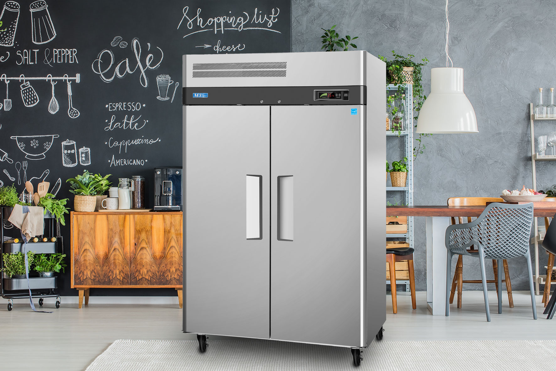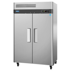 M3 Refrigerator, reach-in, two-section, 47 cu. ft. exterior LED digital thermometer, door open beep, self-diagnostic monitoring system, hot gas condensate system, automatic fan motor delays, door pressure release, LED interior lighting, self-cleaning condenser device, (2) hinged solid door with recessed handle & lock, (6) PE coated wire shelves, stainless steel front & sides, aluminum interior with stainless steel floor, 4" swivel casters, top mount self-contained compressor, 1/3 HP, 115v/60/1, 9.2 amps, NEMA 5-15P, NSF 7, cETLus