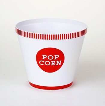 This cute red and white stripped little bucket holds approximately 2 cups of popcorn! Small plastic bucket measures 5" across the top and 4.5" tall. There is an insert in the bottom of the bucket keeping the un-popped kernels separate - from the delicious popcorn you are about to enjoy.