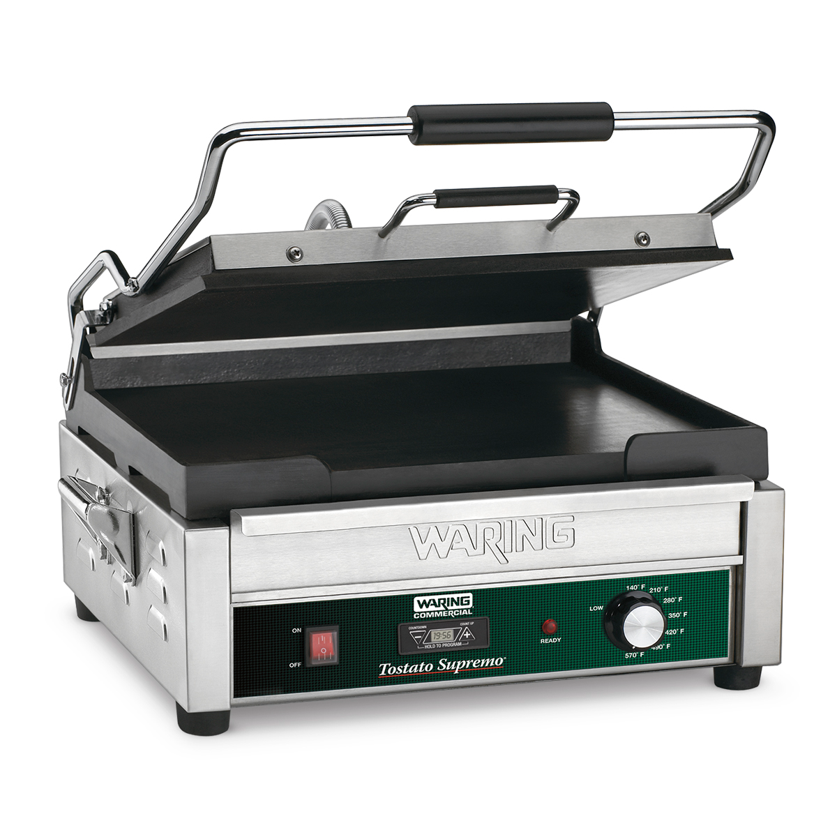 Make all of your signature sandwiches and more with the 120V Waring WFG250T Large Italian-Style Flat Grill. Flat cast-iron plates heat evenly and quickly grill sandwiches, burgers, chicken and vegetables up to 3" thick. The brushed stainless steel body and removable drip tray are easy to clean. Includes adjustable thermostat to 570°F plus power ON and READY indicator lights, and timer.