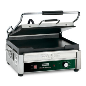 Make delicious quesadillas, tortillas, paninis and more with the 120V Waring® WFG275 Full Size 14" x 14" Flat Toasting Grill. Flat cast-iron plates heat evenly and quickly to cook sandwiches, burgers, chicken, and vegetables up to 3" thick. Its brushed stainless steel body and removable drip tray are easy to clean. Includes POWER and READY indicator lights.