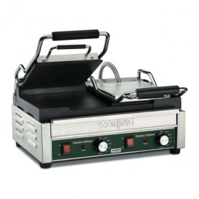 Make all of your signature sandwiches and more with the 240V Waring WFG300 Tostato Supremo Double Italian-Style Flat Grill. Flat cast-iron plates heat evenly and quickly to cook sandwiches, burgers, chicken, and vegetables up to 3” thick. The brushed stainless steel body and removable drip tray are easy to clean. Includes adjustable thermostat to 570ºF plus POWER and READY indicator lights.