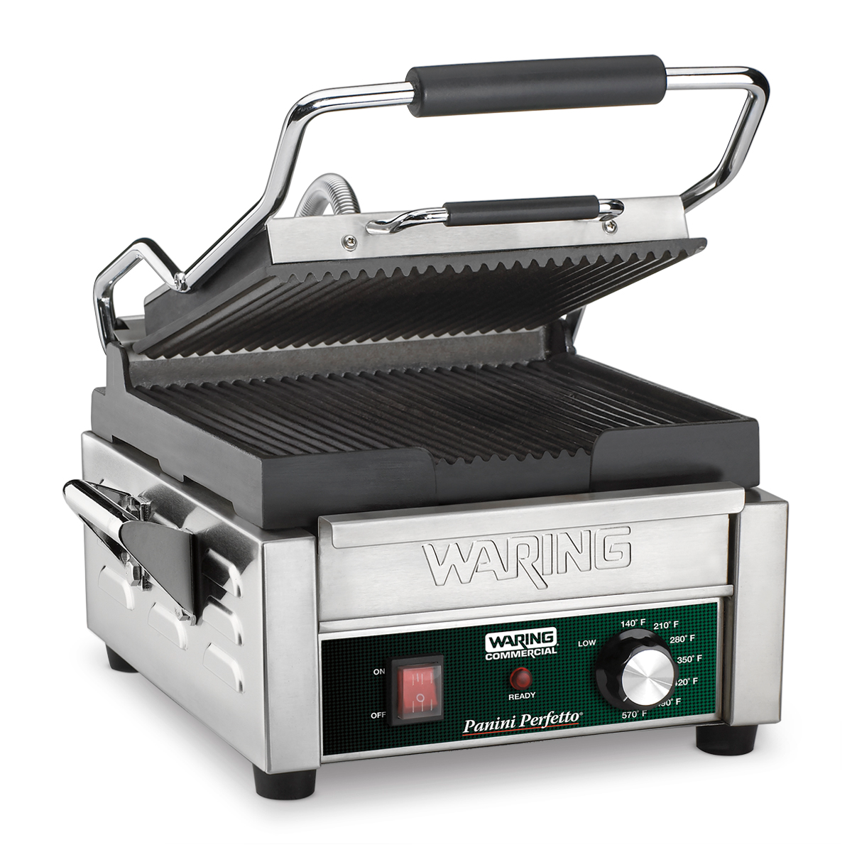 Make perfectly grilled panini sandwiches and more with the 120V Waring WPG150T Compact Italian-Style Panini Grill with Timer. Grooved cast-iron plates heat evenly and quickly cook sandwiches, burgers, chicken, and vegetables up to 3 inches thick. Its brushed stainless steel body and removable drip tray are easy to clean. Includes adjustable thermostat to 570°F, POWER and READY indicator lights and timer.