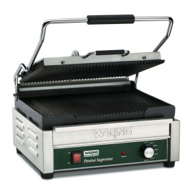 Make perfectly grilled panini sandwiches and more with the 208V Waring® WPG250B Large Italian-Style Panini Grill. Grooved cast-iron plates heat evenly and quickly cook sandwiches, burgers, chicken, and vegetables up to 3" thick. Its brushed stainless steel body and removable drip tray are easy to clean. Includes adjustable thermostat to 570°F along with POWER and READY indicator lights.