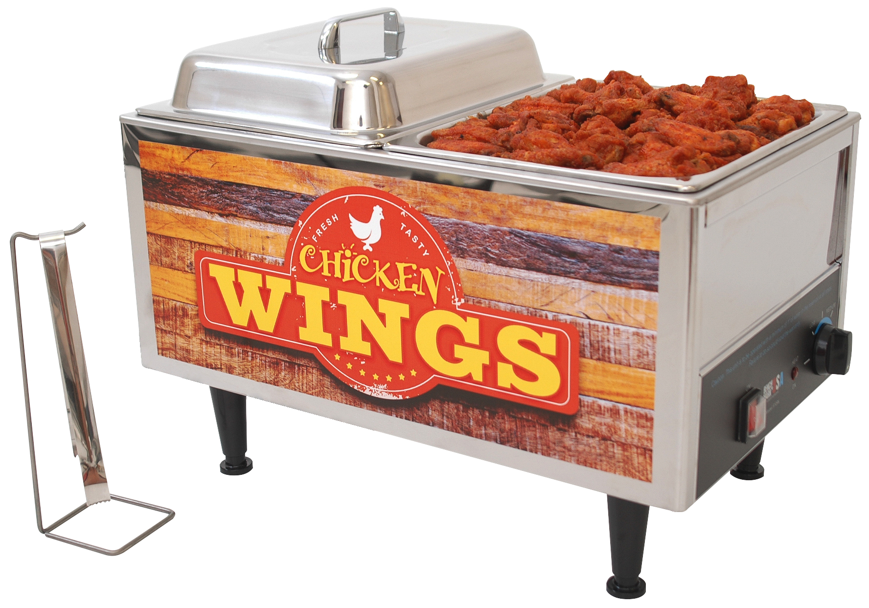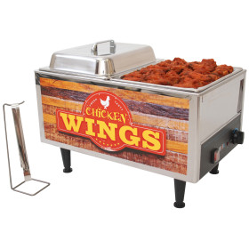 Our new food warmer is specifically designed for chicken wings. The twin 4" deep half-sized pans and 2" high domed lids provide a large capacity while allowing for different flavors to be merchandised simultaneously. It is constructed out of mirror finshed 18/8 stainless steel and comes with Benchmark USA's three year parts warranty for worry free operation. The extra long legs provide easy access for cleaning while the eye-catching graphics promate sales. All of the pans and lids are removable for easy sink or dishwasher cleaning. It has a covered master switch and adjustable thermostat for all cooking/holding conditions.
